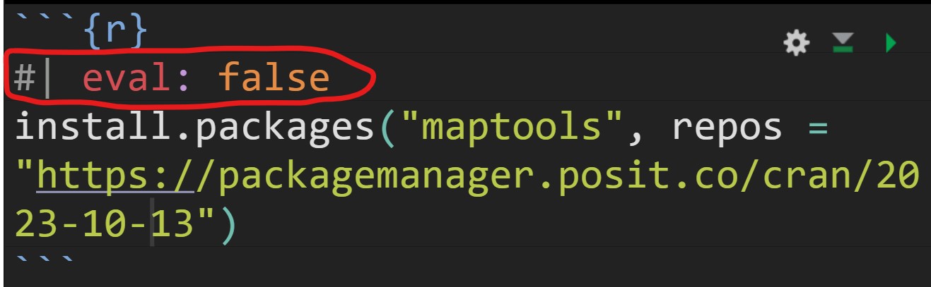 After the installation is completed, it is important to edit the code chunk as shown below in order to avoid maptools being download and install repetitively every time the Quarto document been rendered.