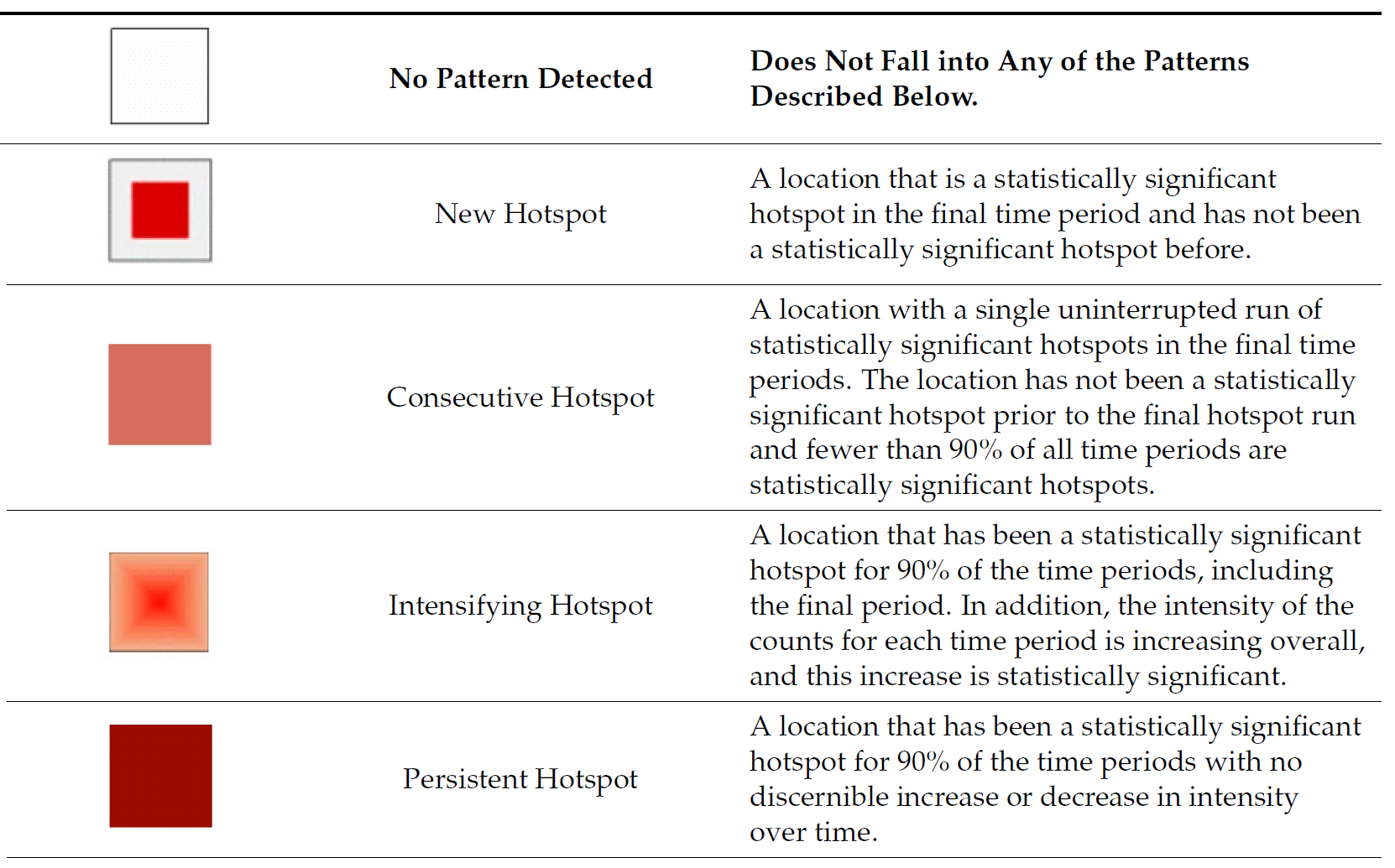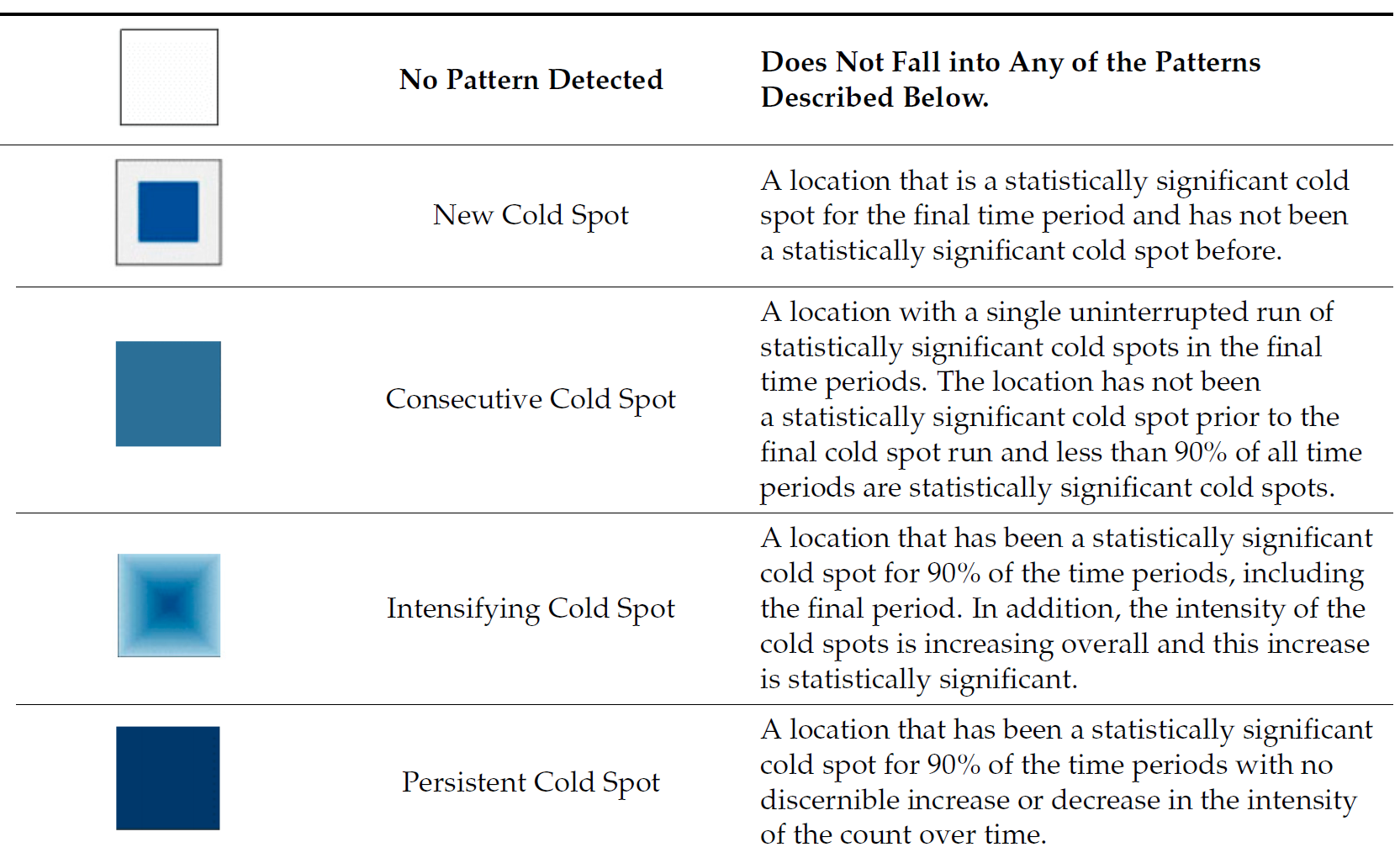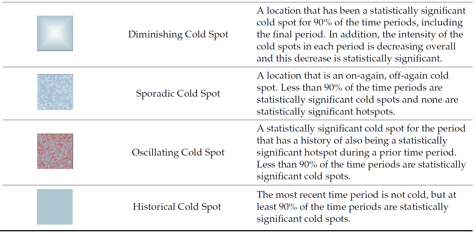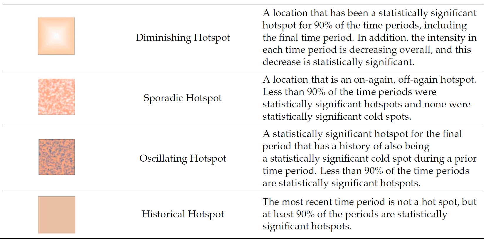 Emerging Hot Spot Analysis (EHSA) is a spatio-temporal analysis method for revealing and describing how hot spot and cold spot areas evolve over time. The analysis consist of four main steps: